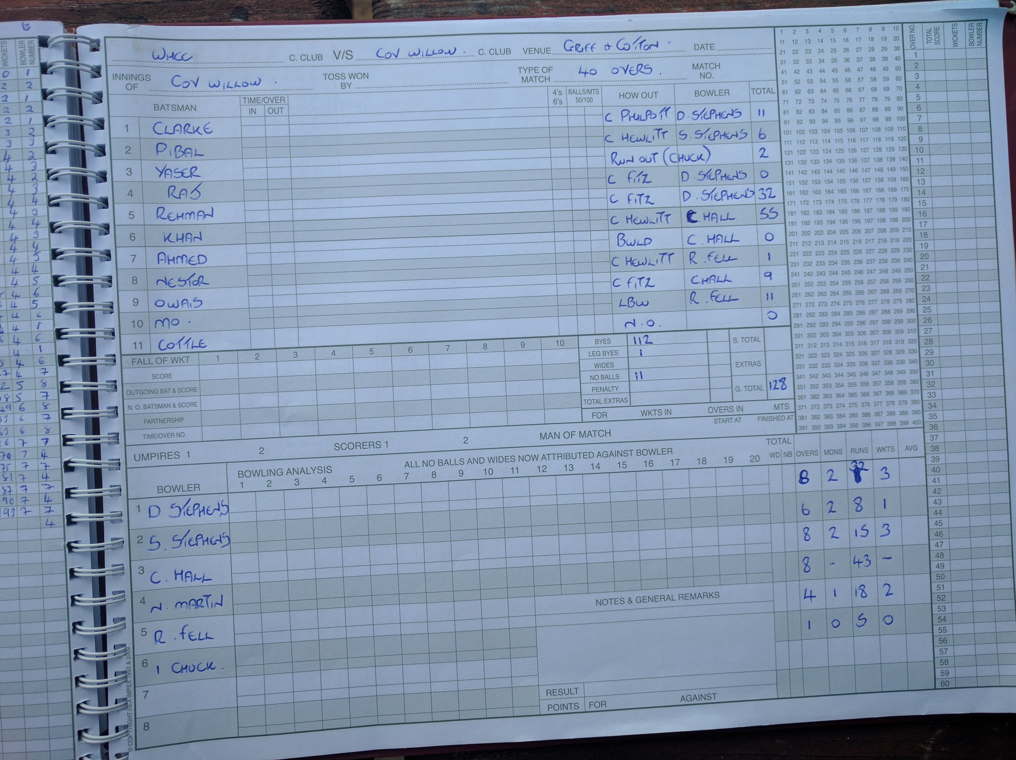 Sam Stephens opened up, using the John Nicholls feather to mark his run up,  paying homage to a club legend. Sam was in no mood to dish out donations. Steaming in for 6 overs, conceding just 6 runs, scaring the life out of the Willow opener with a throat ball, who perished to a Hewlitt diving catch. Vintage Sam. At the other end, Father Dave, rock solid as ever picked up 3 wkts, two of which, caught behind by Fitzy, who gave an exhibition of quality glovework, to complete an excellent individual game.