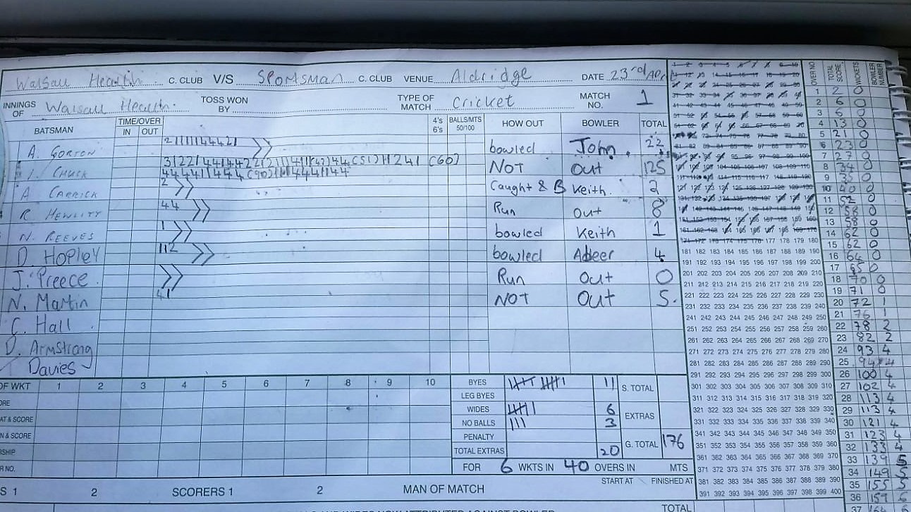 Walsall Health CC 176-6 (40 overs) beat Sportsman CC 140-9 (35.1 overs) by 36 runs