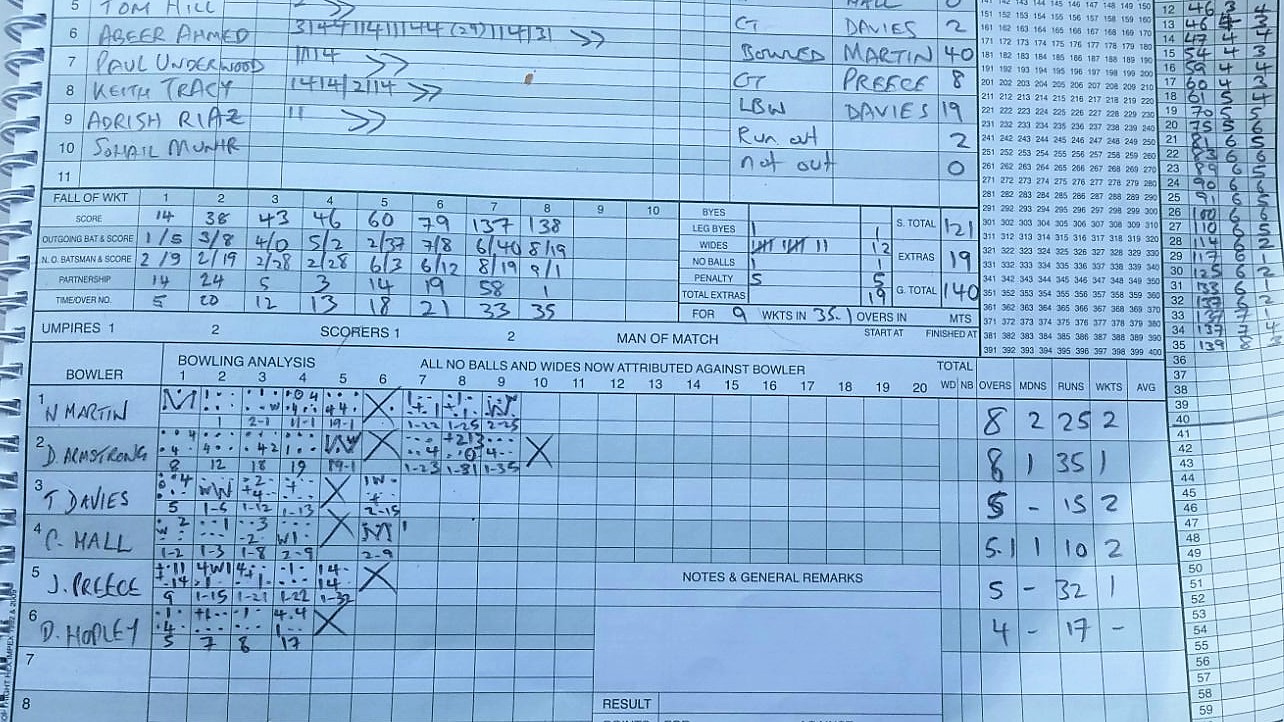 This led to a bit of a middle order collapse with Nathan Reeves and Rob Hewlitt going for 1 and 8 respectively, Rob ran out by Chuck……