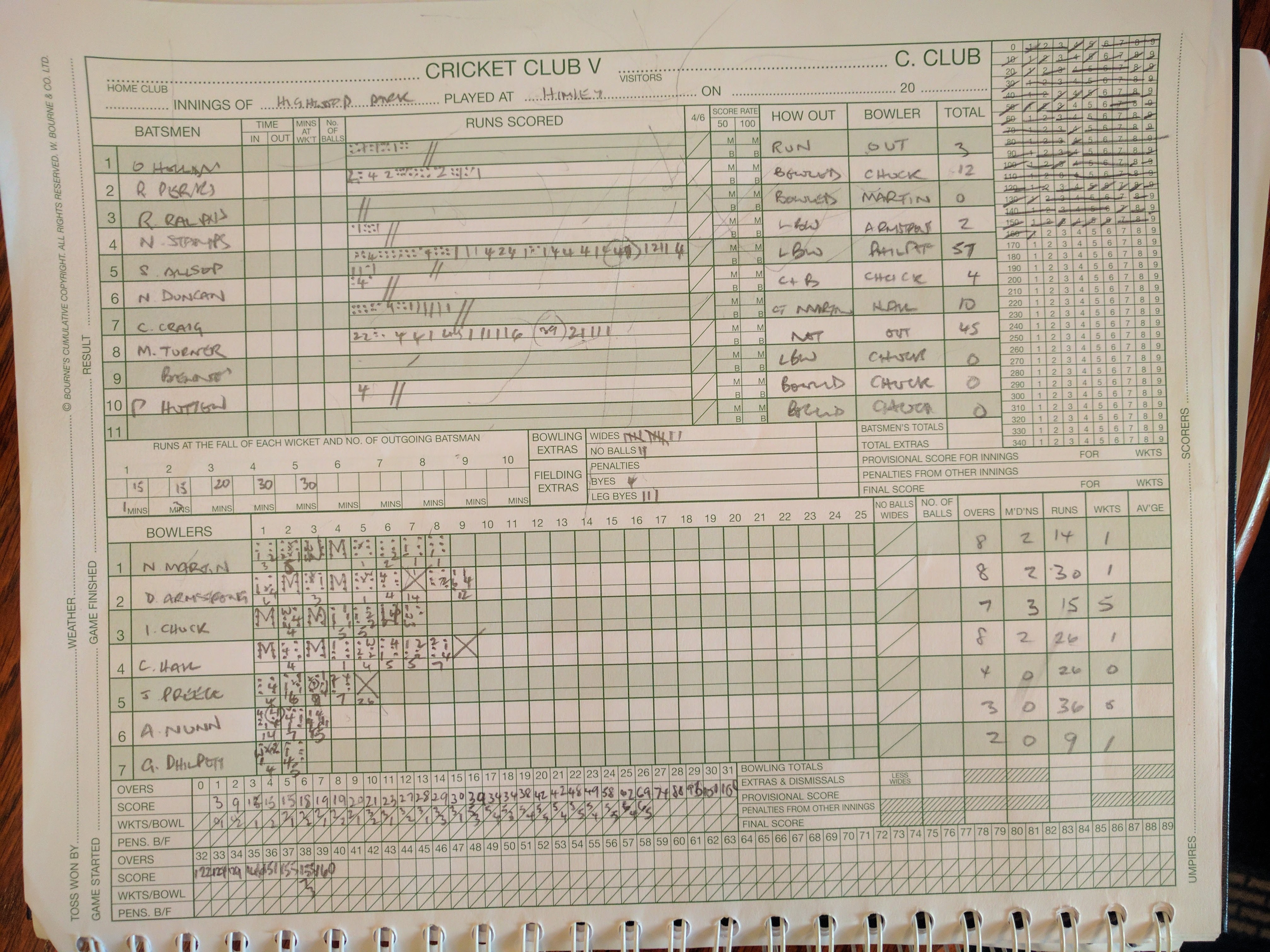 After another 50 partnership between the two openers, Gort departed for 28, followed by Alex Nunns who was trying to force the pace after drinks. We needed to increase the run rate. No better man for that job than Nathan Reeves. Looking more confident than in recent weeks, Nath smashed three 4’s, and scurried a rapid 3 in a hand time of 0.32 secs. His quickfire 19, gave the innings the impetus it needed.
