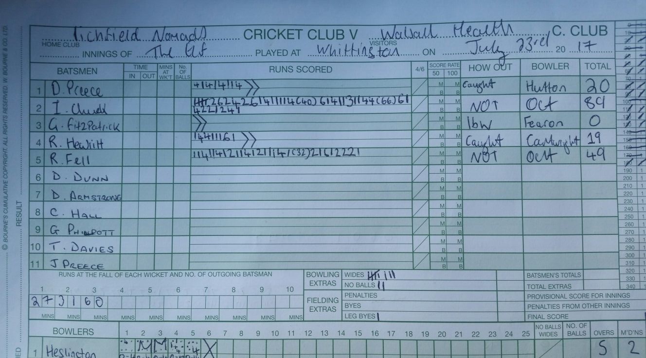 Walsall Health 188-3 (40 overs) beat Lichfield Nomads 84-9 (40 overs) by 104 runs.