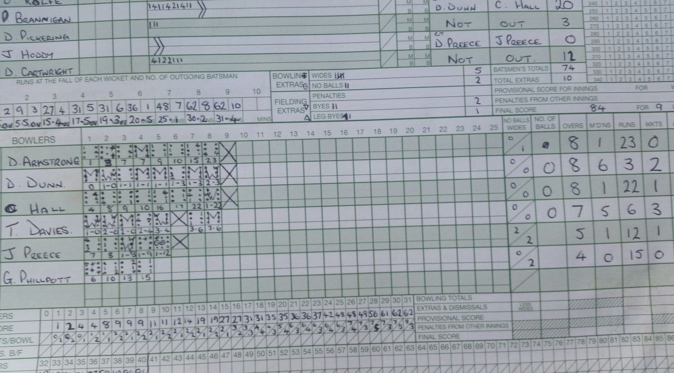 and took a good catch. The ninth wicket was something straight out of Dai’s garden in the early 2000s: Preece to Preece when Hoddy chipped JP to Dave and Nomads were 9 down.