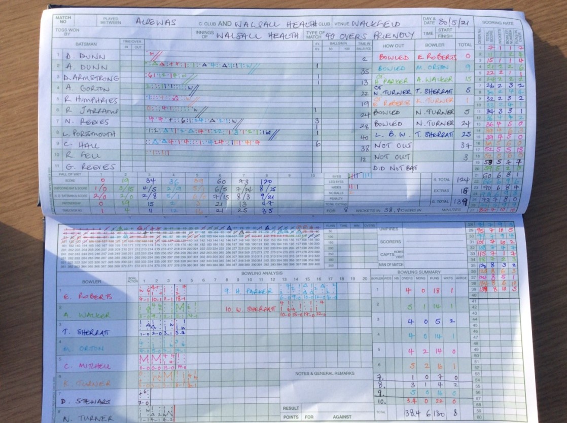 Walsall Health CC (139-9) def. Alrewas CC (135 all out) by 1 wicket.