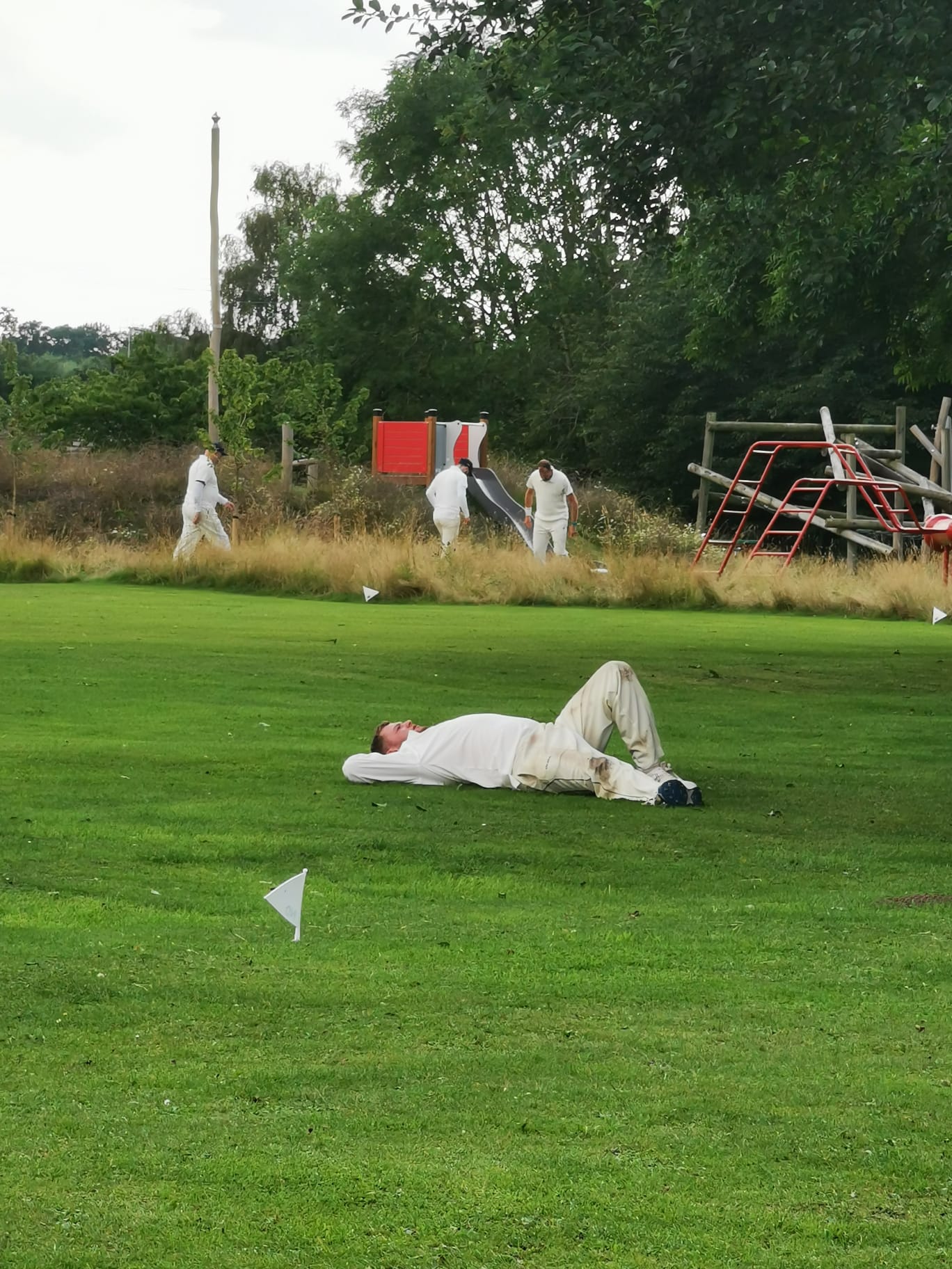 The departure of Rob saw the introduction of Alex Nunns. This was a bowler’s nightmare; two batsmen, one left-handed and one right-handed batsman, occupying the crease. This was surely going to see constant field changes. The two started batting with intent, hoping to increase the run-rate. Good running between the wickets coupled with controlled boundary hitting propelled the Elf to 123-3. Just as the two were building a good partnership, Chuck (currently on 47) played a shot down to mid-on and followed it with a call of “yes”. As soon as he set off, the Peopleton fielders sensed an opportunity of a run out and quick reactions saw the end of Chuck’s innings when he was closing in on his 50. The frustration was there for all to see. This was followed by Chuck’s comment “Why did I run? There was no run there”.