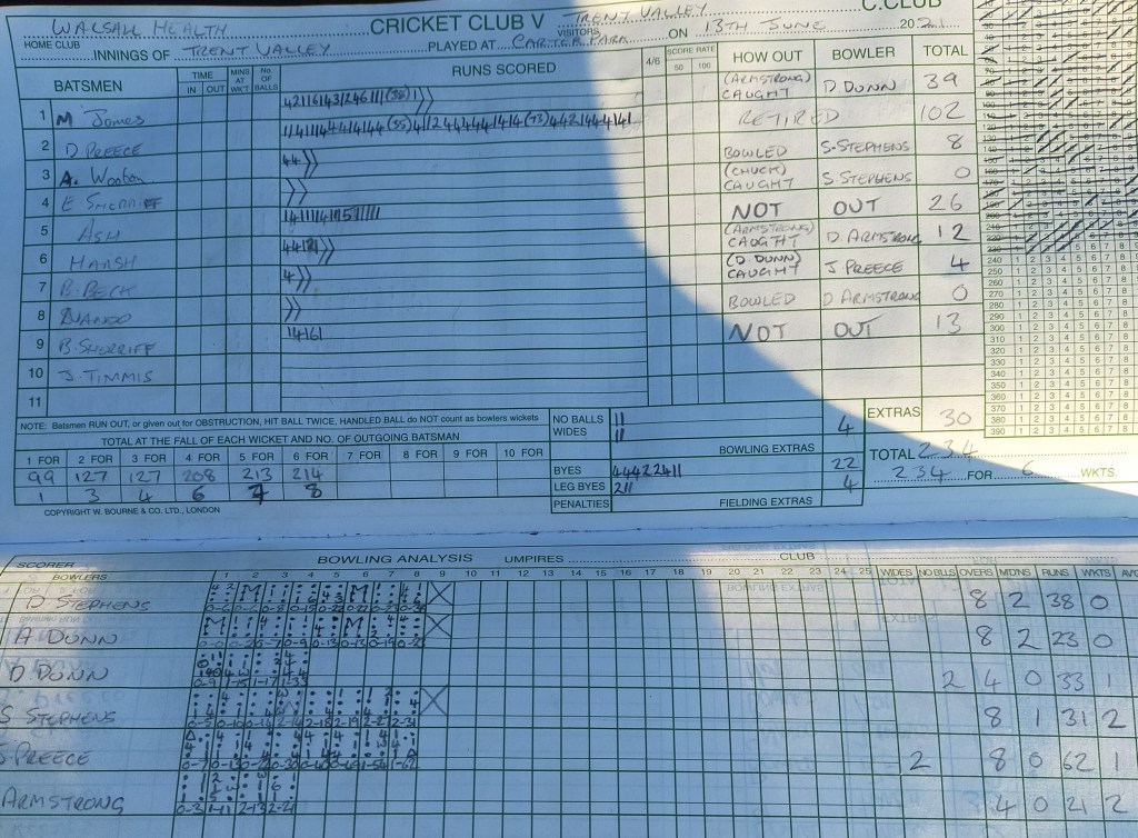 Greg came and went for 6 before Rob got a typical Rushall delivery where the ball just died and he was out 7 short of what would have been an excellent fifty.