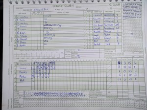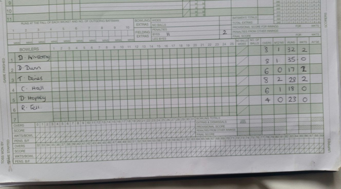 The wind chill factor was certainly affecting the players and spectators but the opening partnership went nicely past fifty and Nath Martin (who had ‘done a lap’ with Chorley and Dan ‘two plates’ Armstrong) called Tom Davies from the other side of the field who was scoring to ask what Chuck was on, 27 was the reply and the Elf lads watched on nervously for a few more overs.