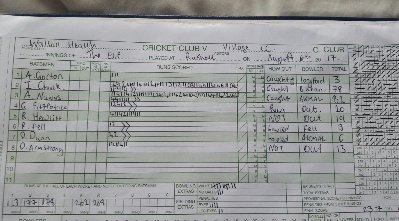Chuck and Al put the Lapworth boys to the sword in the overs that followed, boundaries galore in a 173 run stand putting that partnership 3rd on the Elf all time list. Good biffing lads. Chuck eventually out for 78, 23 runs over what was required in what’s been a top season with the wood in his hands.