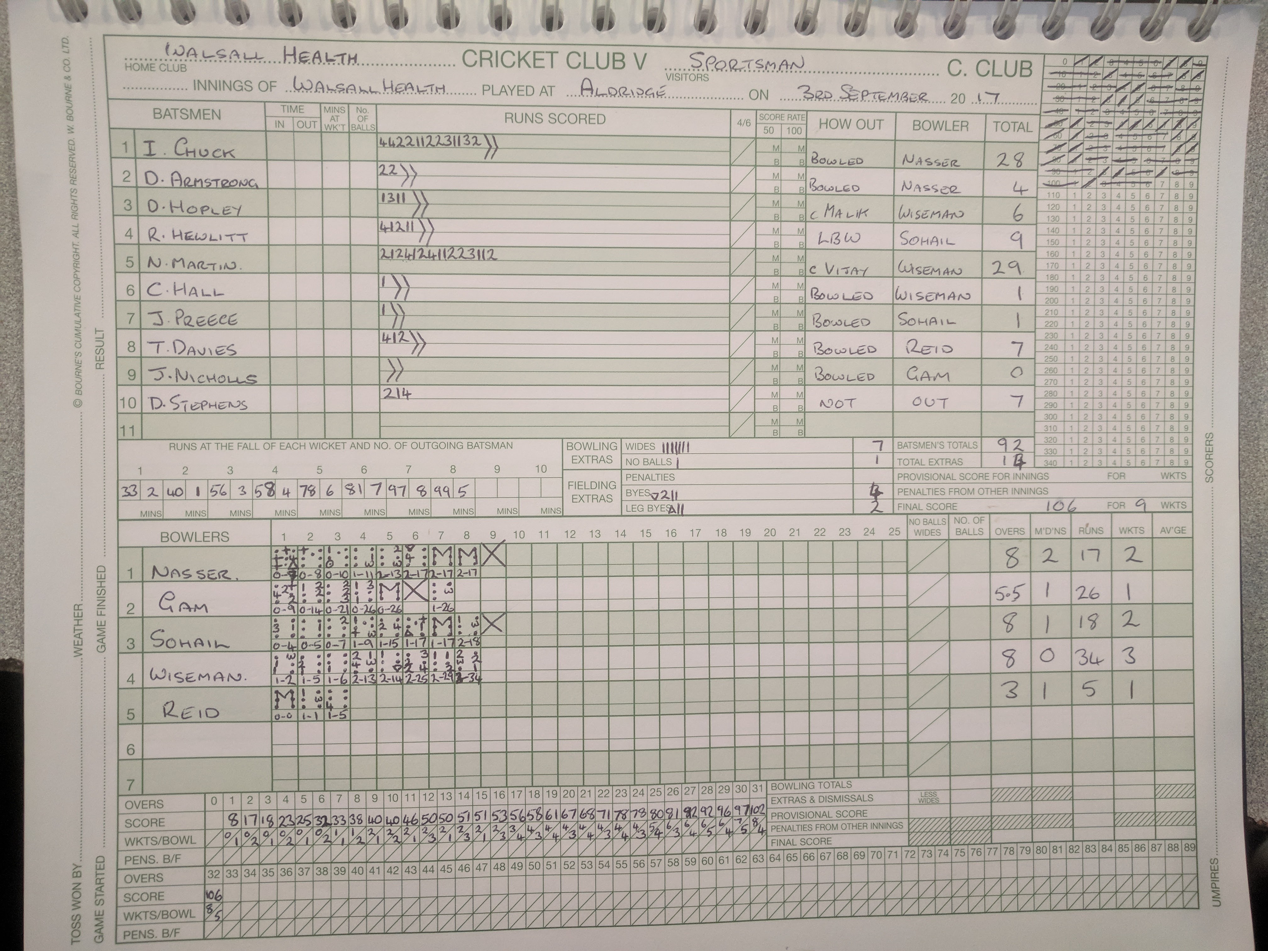Walsall Health CC 218-3 (38 overs) v.s. Lapworth CC 24-0 (6 overs) MATCH ABANDONED
